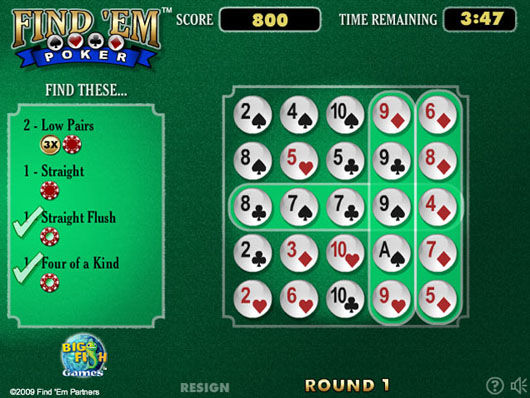 Find the perfect poker hand in this Hidden Object Card game! Discover all the combinations to move on to the next level. Score as many points as you can and become a card shark in Find ‘em Poker!
